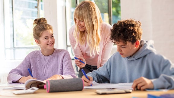 Bei uns lernen die Schülerinnen und Schüler ohne Druck in kleinen Gruppen mit Gleichaltrigen und bekommen den Spaß am Lernen zurück – und das schon ab durchschnittlich 8,76 €* pro Unterrichtsstunde. Qualifizierte Nachhilfelehrerinnen und Nachhilfelehrer und ein regelmäßiger Austausch mit unseren Schülerhilfeleiter:innen fördern die Leistung der Kinder und Jugendlichen.