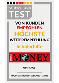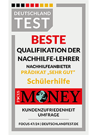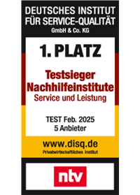 Deutschlands Profi-Nachhilfe Nr. 1 / Testsieger: Testsieger der Studie „Von Kunden empfohlen“, DEUTSCHLAND TEST/ServiceValue 2024, in der Branche „Nachhilfeanbieter" ,Platz 1 / Testsieger der ntv-Studie 2023 „Service und die Leistung von Nachhilfeinstituten“ vom Deutsche Institut für Service-Qualität und Platz 1 / Testsieger der Studie "Deutschlands beste Dienstleister 2024" in der Branche "Online-Nachhilfe" in der Kategorie "Kundenzufriedenheit".